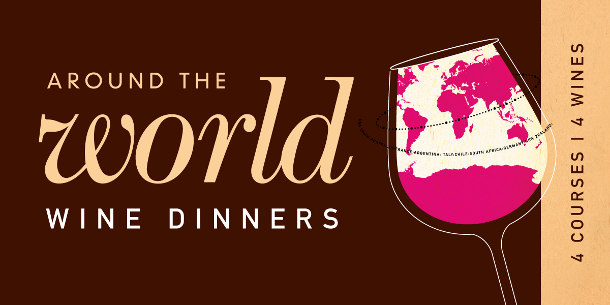 A NOTE ABOUT OUR NEW FORMAT: This January, we’re introducing a new Around the World Wine Dinner series format. Each event will begin at 6:30pm with passed appetizers and cocktails from our cash bar and will be followed with a 4-course dinner from 7pm to 9pm. We’ll continue to serve perfectly paired wines with each course as well as interesting facts about our chosen location or theme. We hope you can join us!